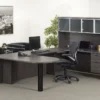 The Peninsula Desk is offered in various sizes and finishes, with the option to choose a left or right-side opening when viewed from the front. The model shown features a Slate Gray finish, a single drawer set, and an overhead hutch, with the right-side opening displayed. Multiple drawer configurations are available, and the desk is backed by a 5-year manufacturer’s warranty.