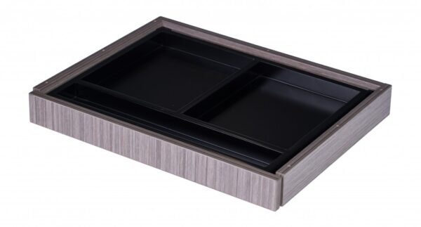 The pencil drawer organizer can be mounted under Commerce Laminate series desks by Boss Office Products. It has three compartments for storage and it can be custom ordered in different finishes, Driftwood shown. It measures 28″W x 18″D and it’s made with a commercial grade laminate.