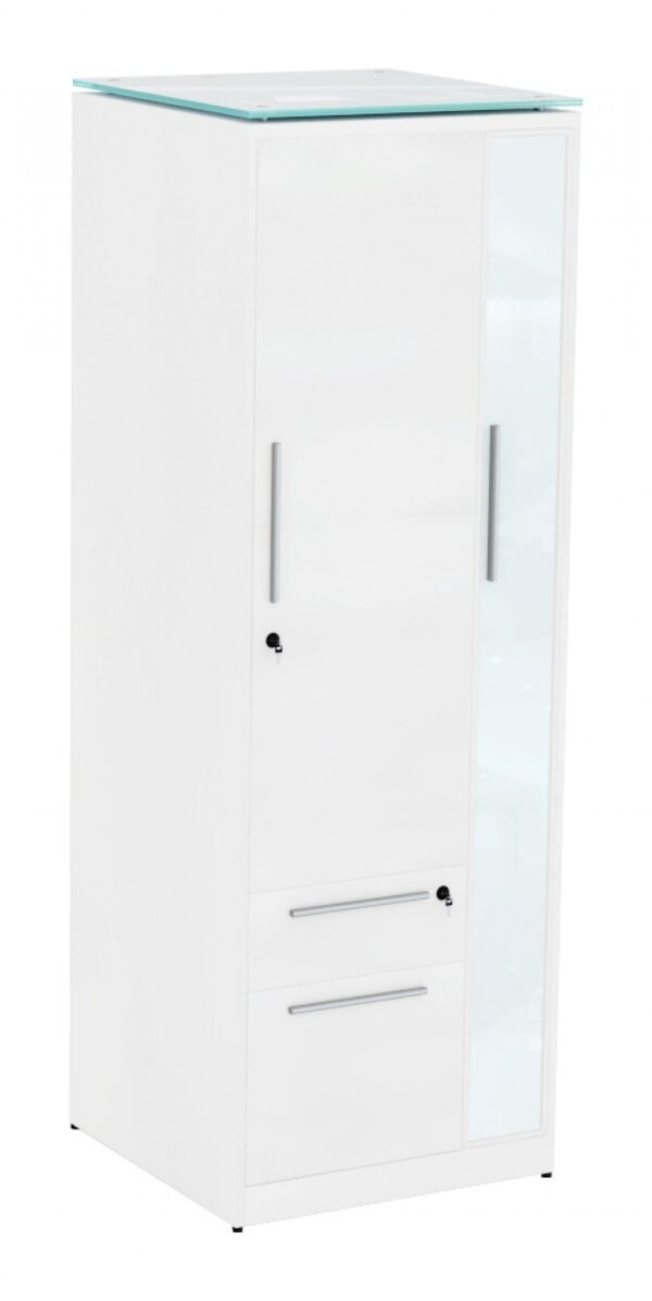 The locking storage cabinet has a reversible design, allowing you to install the wardrobe storage with the slim glass door on either side. It features a hinged laminate door, two adjustable shelves, a set of box/file drawers, a white glass door, and a clothes hanger bar. It comes equipped with adjustable leveling glides and is available in different finishes, Blanco shown. Quality guaranteed by a limited lifetime warranty.