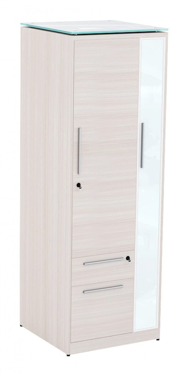 The tall storage cabinet features a reversible design, allowing you to install the wardrobe storage with the glass door on either side. It includes a hinged laminate door, two adjustable shelves, a set of box/file drawers, a white glass door, and a clothes hanger bar. Equipped with rechargeable LED lights, this cabinet is available in different finishes, Blanc De Gris shown. Quality backed by a limited lifetime warranty.